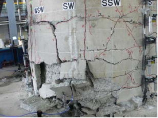 E-ディフェンスを用いた壊れにくい次世代型RC(鉄筋コンクリート)橋脚の震動実験を行いました。 回の試験体は、基本的には現行基準に沿って設計するものの、過去の試験体と較べ、被害が発生しやすい橋脚基部部分における粘り強さを増すために、通常のコンクリートに代えてモルタルの中にポリプロピレン繊維を入れた「高じん性繊維補強モルタル」を採用しているところ、ならびに橋脚試験体の柱部について角部を面取り(R = 400 mm)した矩形断面(1辺1.8 m)としているところに特徴があります。試験体の柱高さ7.5 m、基礎部(底部)は縦7.0 m × 横7.0 m × 高さ1.8 m、全体重量は約310 tで、3日間加震しました。実験により、加振による試験体の損傷状況は、ごく微細なクラックが見受けられる程度で、予想通りの結果となりました。その後、同等の余震を想定して2度同じ加振したところ、大きくひび割れたが、高じん性繊維補強モルタルの剥離はわずかでした。すなわち、今回の新素材を使った橋脚は高い耐震性を有していることが確認されました。