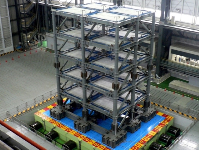 防災科学技術研究所は、米国ネバダ大学と共同で、免震技術の評価実験を行いました。実験では、基礎を固定した耐震構造と免震装置を基礎に組み込んだ免震構造の建物に対して、東北地方太平洋沖地震時の揺れを再現して入力し、免震構造の応答特性把握と構造の違いによる室内被害の違いについて検証しています。