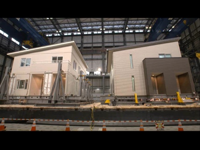 A series of full-scale shaking experiments on a precast and post-tensioned concrete (PPC) structure were conducted to establish high-quake-resistant, productive and reparable concrete buildings. And experiments on a reinforced concrete (RC) structure with almost the same shape of the PPC structure were conducted to acquire usable data for the future development of seismic design method. In the experiments, both the PPC and RC structures were shaken at the same time (the PPC structure at the front and the RC structure at the back of the video). As for the two 4-story buildings, the story height of each floor was 3.0 m, and the long side of the rectangular plane was 14.4 m and the short side was 7.2 m.