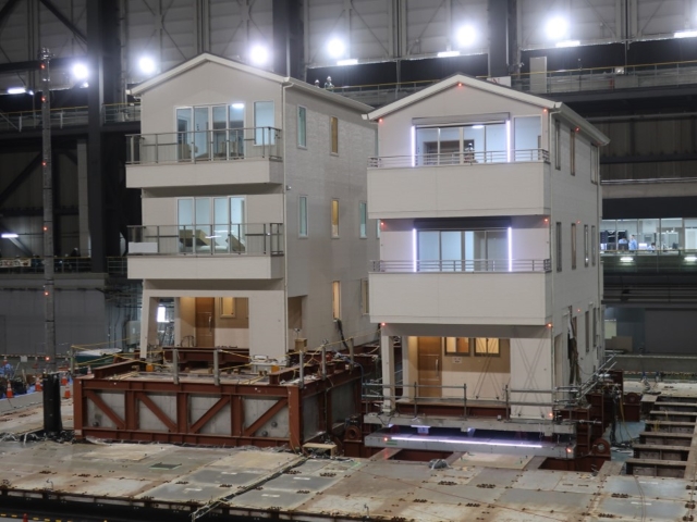 In this experiment, two three-story wooden houses were tested on a shake table: one with an earthquake-resistant structure that had been reinforced to improve its earthquake resistance, and the other with a seismic isolation structure, which is known to be effective for earthquake countermeasures, from the perspective of ensuring the living functions of residential buildings in densely populated residential areas. The size of the test specimen was 4.5 m x 10 m in plan and approximately 10 m in height. For the seismic-resistant structure, a large-scale soil container with internal dimensions of 7 m x 13 m and a height of 2.5 m was constructed, and a 1.3 m deep soil layer was built inside the container to faithfully reproduce the building conditions from the solid foundation to be constructed on top of the soil layer. Valuable data was collected by inputting observation waves from the 1995 Southern Hyogo Prefecture Earthquake, etc.