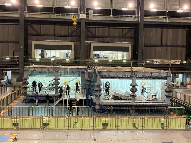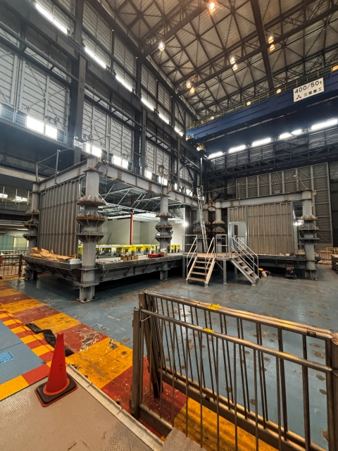 The test specimen for the “Study on Function Maintenance in Indoor Space during Earthquake” has been set up right on E-Defense shaking table after the New Year! Currently, interior work is in full progress in preparation for the shaking table experiments to be performed in coming February and March.